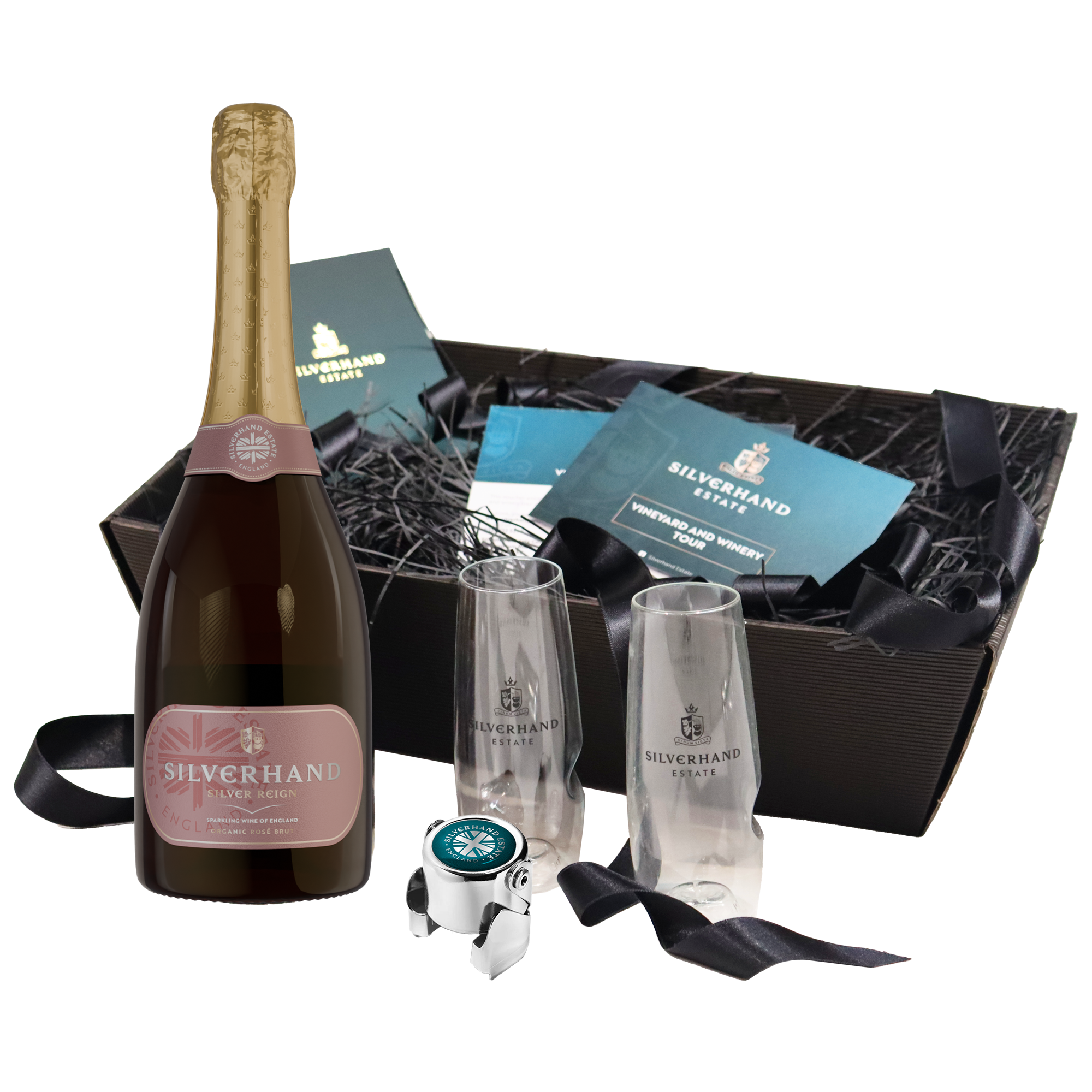 Presented in a black cardboard tray with packing and finished with a black satin ribbon.